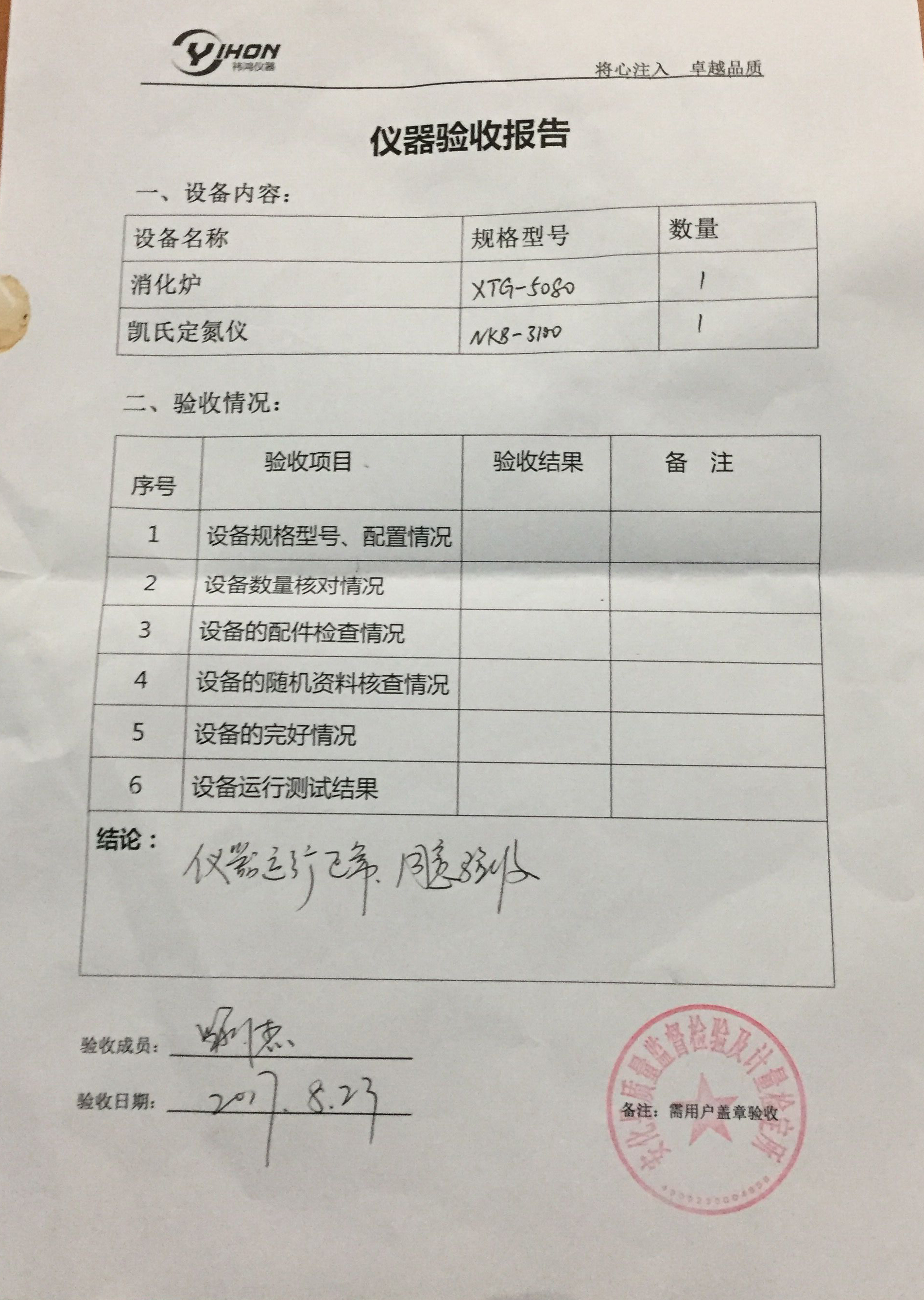 湖南安化縣質(zhì)量監(jiān)督檢驗(yàn)計(jì)量檢定院經(jīng)過嚴(yán)格選型、多方調(diào)研、輪番幾次的技術(shù)交流探討,最終上海祎鴻定氮儀以優(yōu)秀的研發(fā)技術(shù)、過硬的產(chǎn)品質(zhì)量、滿意的售后服務(wù),被順利選中,并提供NKB3100自動(dòng)凱氏定氮儀、XTG5080遠(yuǎn)紅外碳纖維消解儀,已圓滿完成調(diào)試培訓(xùn)驗(yàn)收工作。