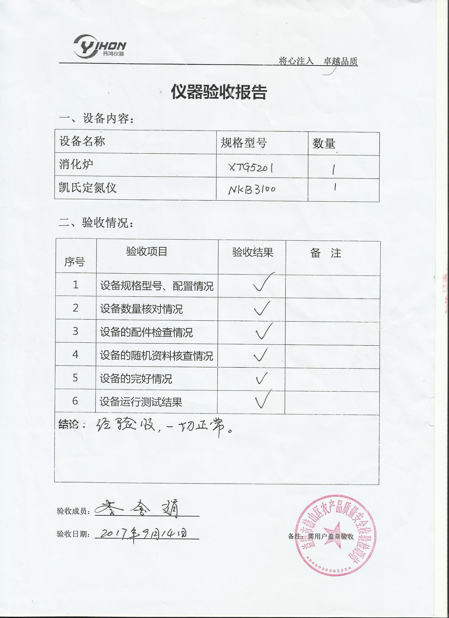 湖南益陽赫山農(nóng)業(yè)局位于洞庭湖區(qū)魚米之鄉(xiāng)益陽,單位主要提供農(nóng)業(yè)技術(shù)指導(dǎo)等工作。近期選擇上海祎鴻定氮儀NKB3100,XTG5201消解儀,對土壤等樣品的氮含量檢測,9月底順利驗收合格。
