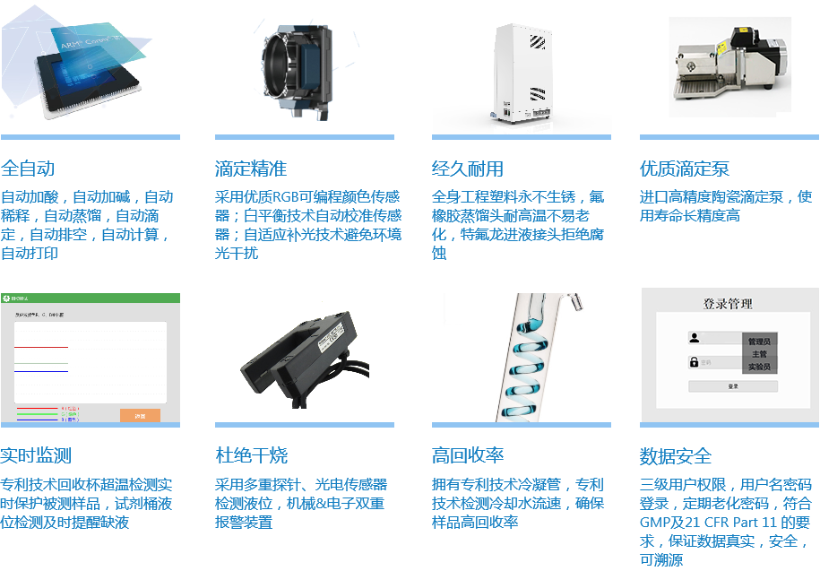 NKY6180凱氏定氮儀采用智能化程序設計,不但具有全程自動加酸、加減、稀釋和自動清洗功能,同時實現樣品在堿性條件下將銨鹽轉化為氨的自動蒸餾;而且在程序設定條件下通過高精度微量計量泵自動完成標準鹽酸滴定,通過RGB可編程光學傳感技術自動判定到達滴定終點,從而計算出樣品中氮的含量。該產品已成為食品企業、農林漁業、高等院校、科研機構、質量機構等部門的重要理化分析儀器。