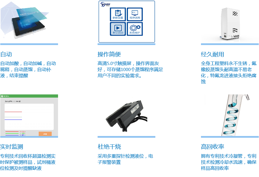 自動化程度 參數設定后,儀器自動完成樣品加酸、稀釋、加堿、蒸餾、吸收及管路淋洗