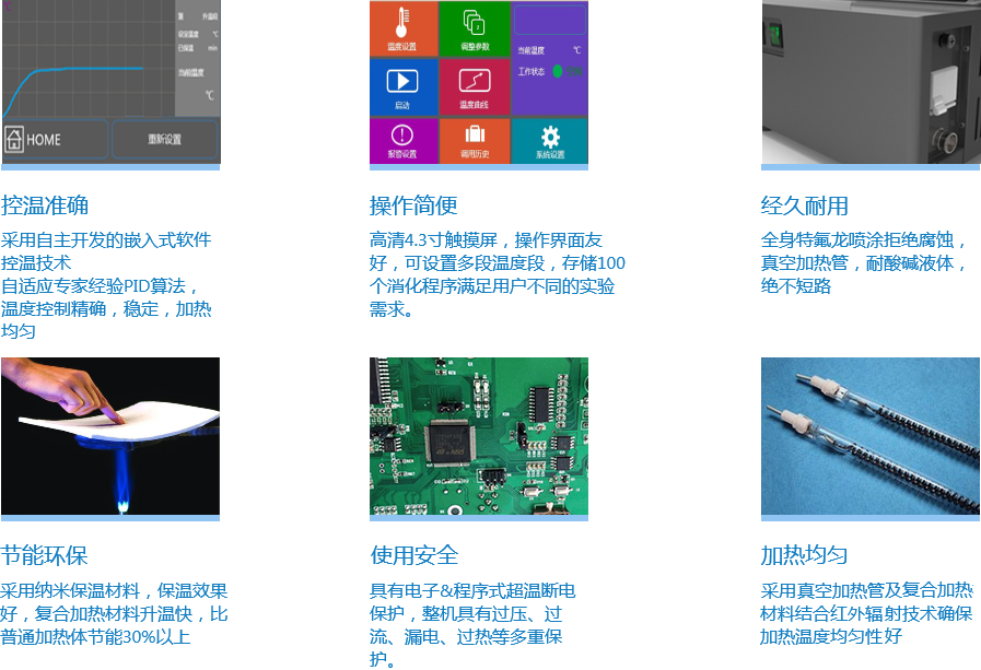 XTG5201紅外消化爐采用復(fù)合電熱絲真空加熱技術(shù),升溫效率